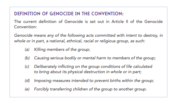 Article II of the 1948 United Nations Convention on the Prevention and Punishment of the Crime of Genocide defines genocide as follows:
