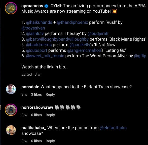 “We were thrilled that a performance celebrating Elefant Traks and its contribution to Australian music was part of the APRA Music Awards in May. The awards are not broadcast or live streamed and are an industry-only in-person event. All our publicity and social media content is posted to celebrate and promote the nominees and winners of all the awards including the Peer-Voted Song of the Year and the Ted Albert Award winner, Bart Willoughby, and at no stage did we remove any of the content from our channels.”