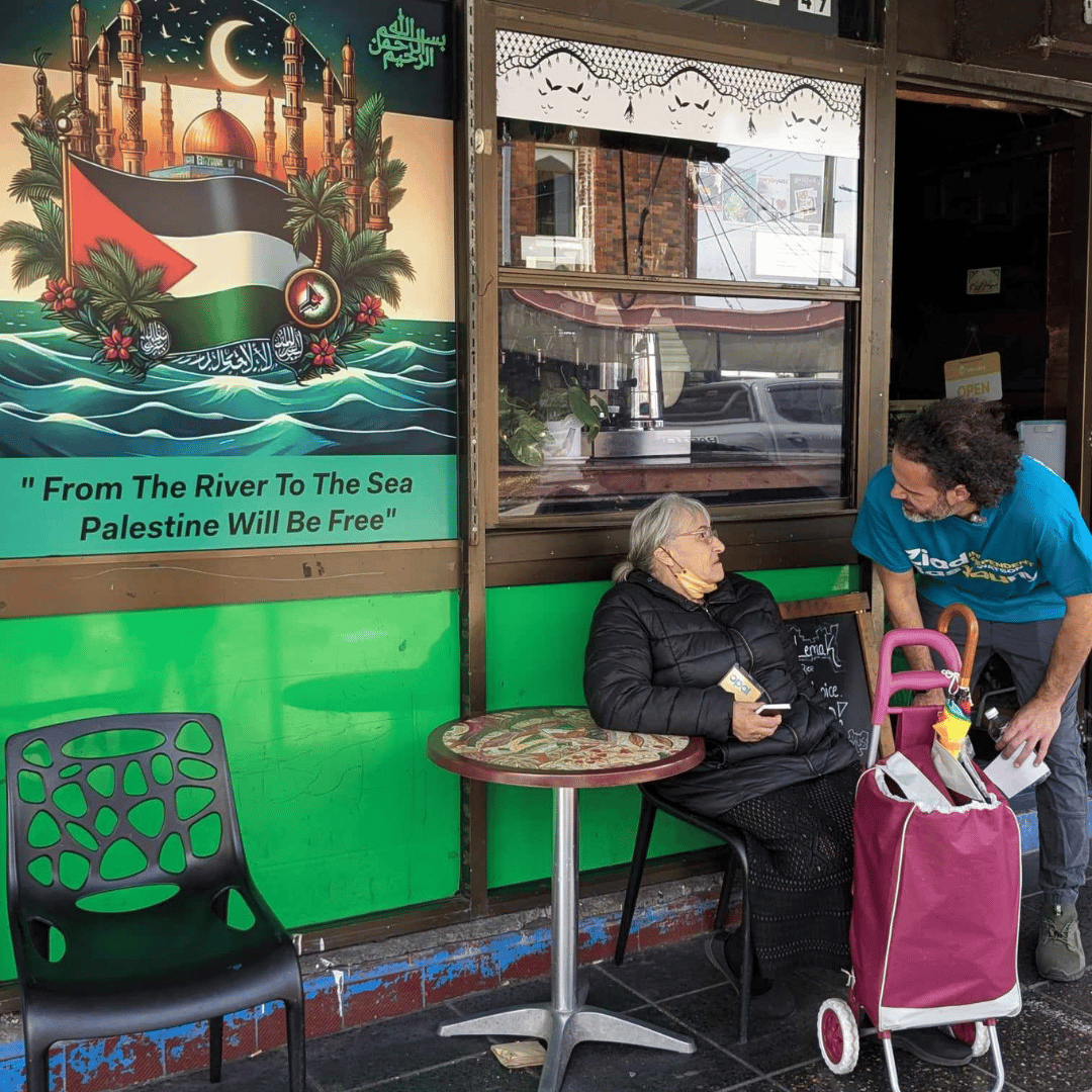 Out on Haldon Street in Lakemba, the mood among volunteers is upbeat. People doing the shopping or getting chai from Dhaka Delight are happy to stop and chat. Every other shop window has a Palestinian flag in it.