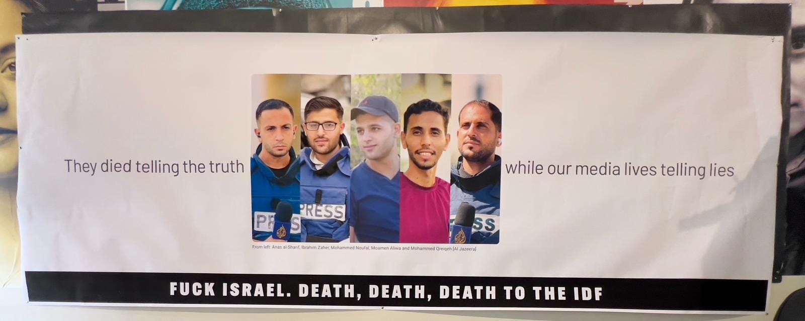 In August, Agzarian displayed a poster in the window of his studio. It showed the images of five Palestinian journalists slain by Israeli forces in Gaza that month – an attack that provoked global outrage.