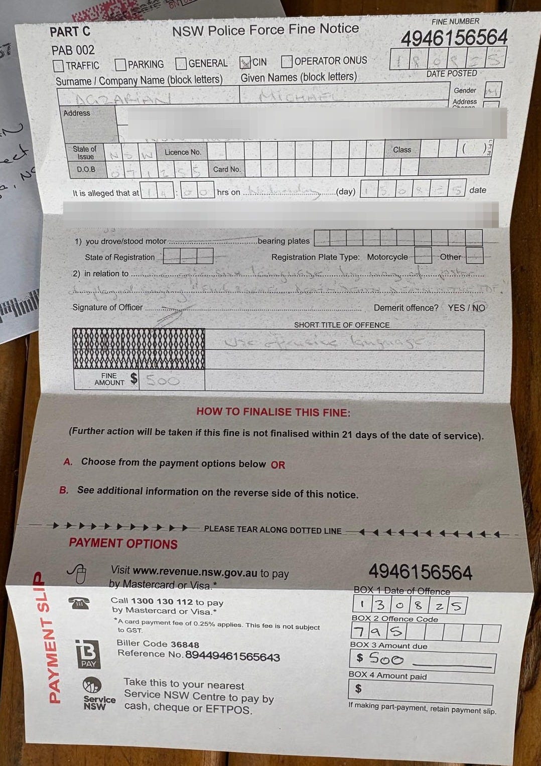 On August 18, Agzarian received an infringement notice from NSW Police with an order to pay $500. The crime? “Offensive language”.