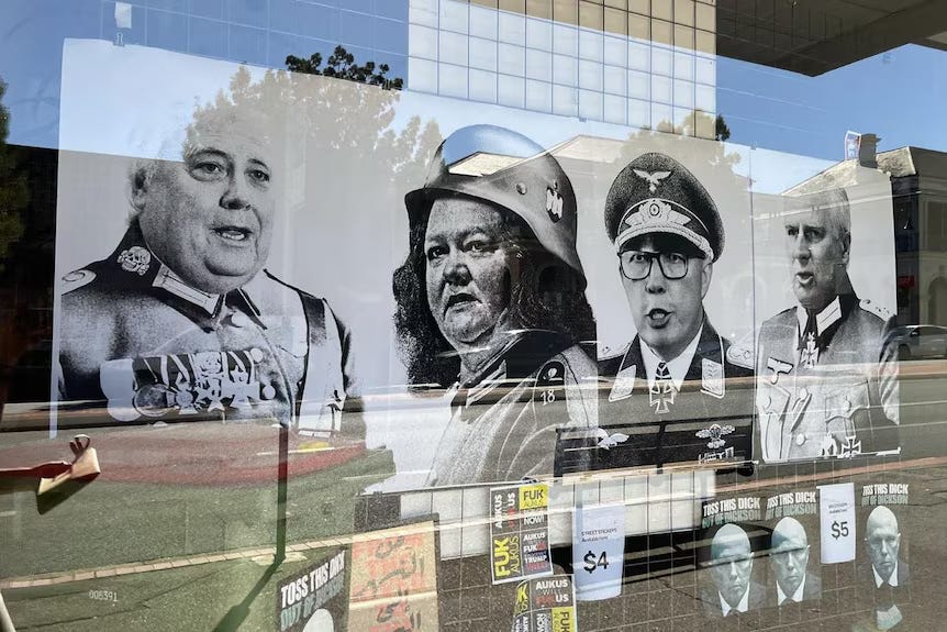 This is not the first time Agzarian has drawn the ire of the powerful. In March, he displayed another poster of his own making – one that depicted Gina Rinehart, Peter Dutton, former Nationals leader Michael McCormack and Clive Palmer in Nazi military uniforms. Police charged him for displaying Nazi symbols. Agzarian pleaded not guilty in a court appearance in August.