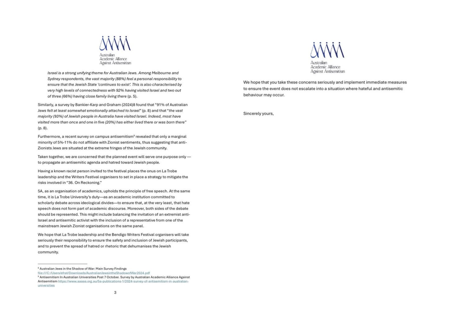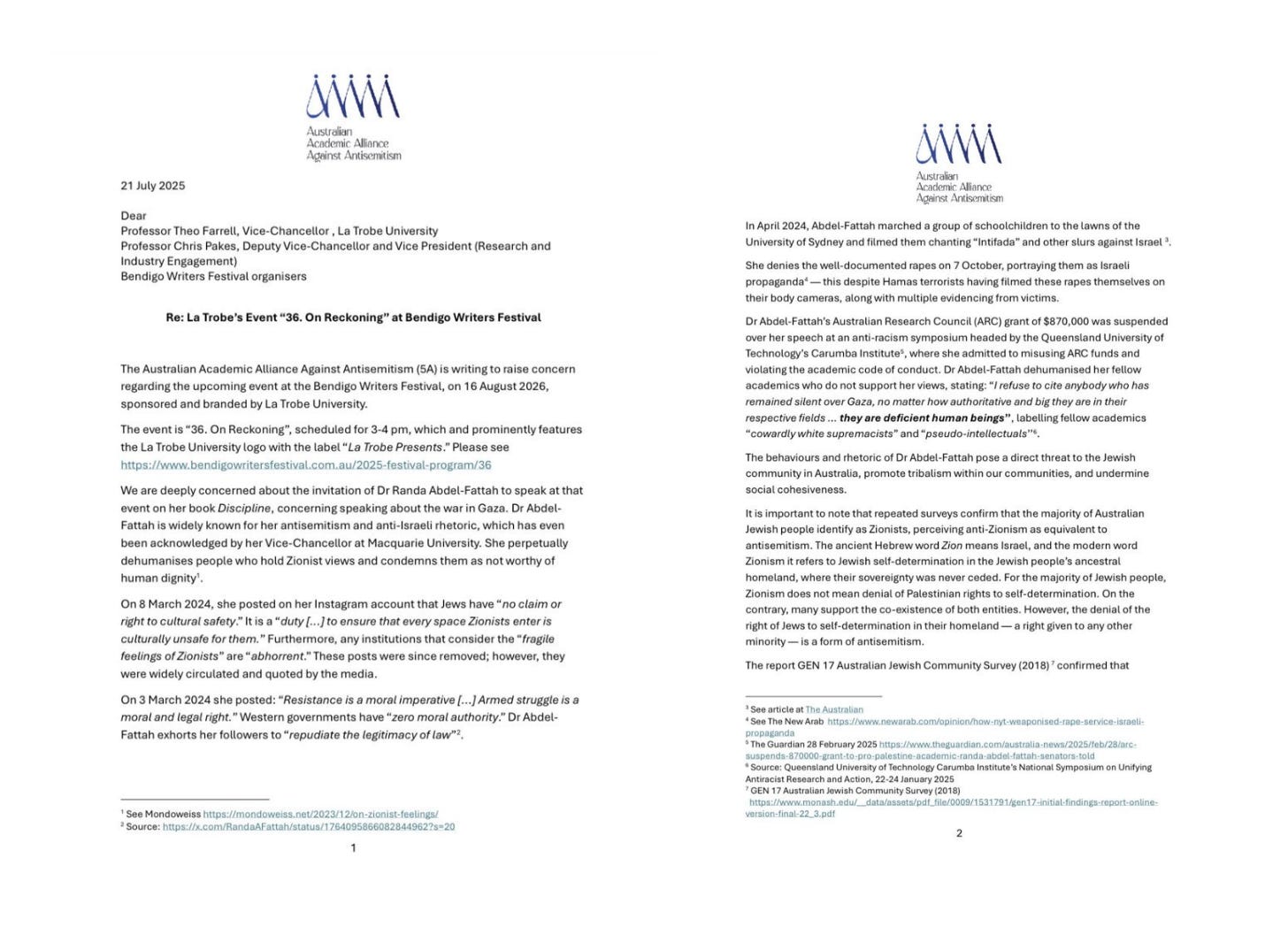 On July 21, a letter from the Australian Academic Alliance Against Antisemitism (5A) to La Trobe University's vice-chancellor, Prof. Theo Farrell, deputy vice-chancellor, Prof. Chris Pakes, and Bendigo Writers Festival organisers raised concerns "about the invitation of Dr Randa Abdel-Fattah", whom it described as "an extremist anti-Israel and antisemitic activist" and "a known racist person".