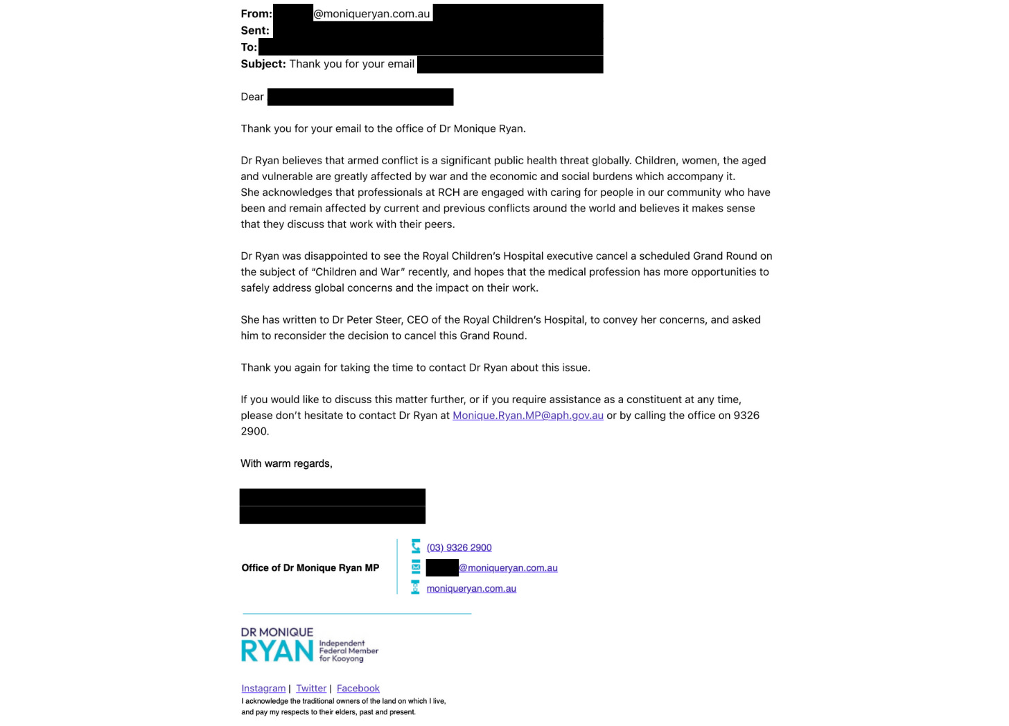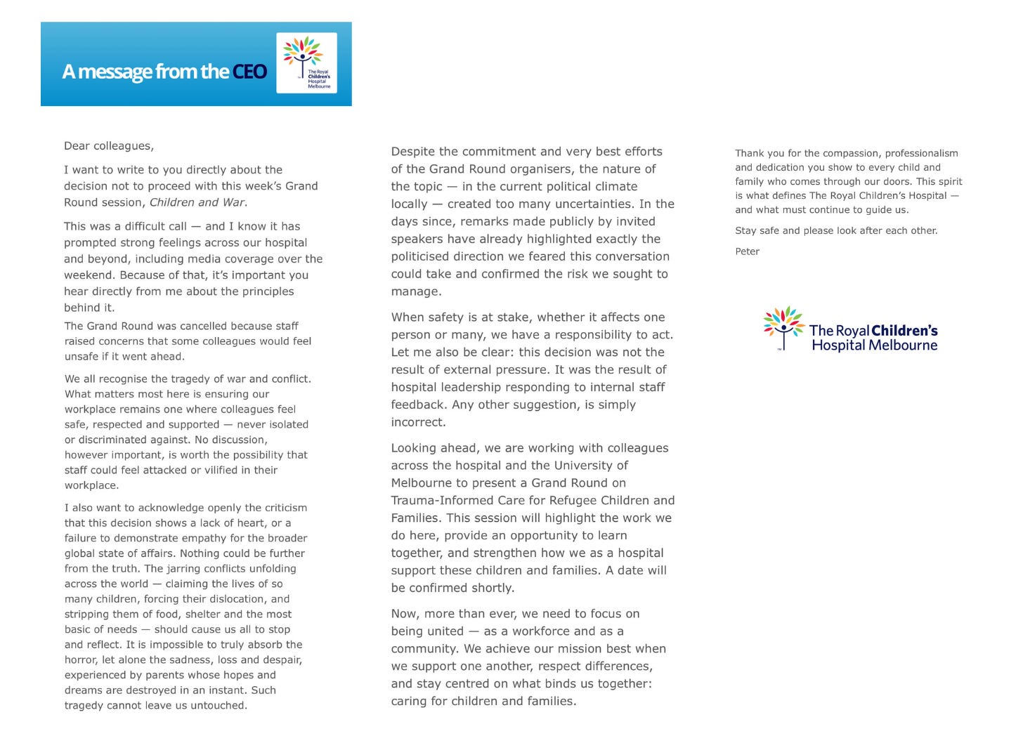 “Dr Ryan was disappointed to see the Royal Children’s Hospital executive cancel a scheduled Grand Round on the subject of ‘Children and War’ recently, and hopes that the medical profession has more opportunities to safely address global concerns and the impact on their work,” the email read. Ryan is a former director of neurology at RCH.