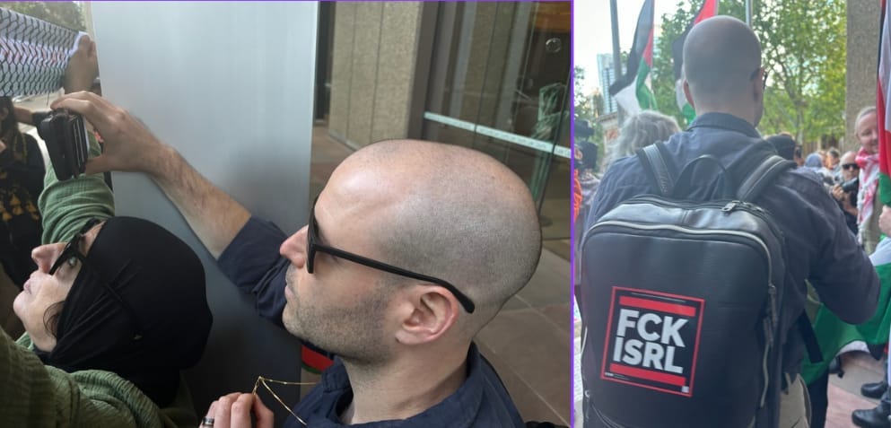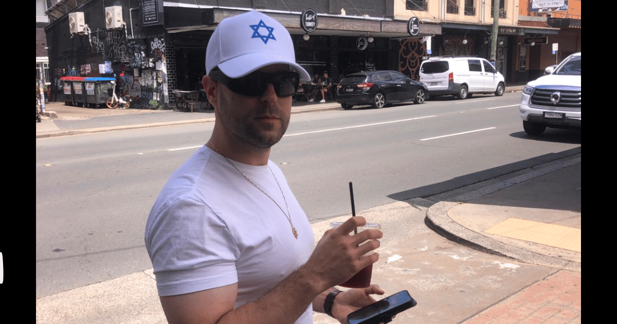 The man in the white t-shirt has been identified as Ofir Birenbaum, a consultant for a software company and a prolific Zionist agitator who has been extensively quoted and profiled by News Corp publications. The Australian Jewish Association has also described Birenbaum as a “Friend of AJA” in multiple social media posts.