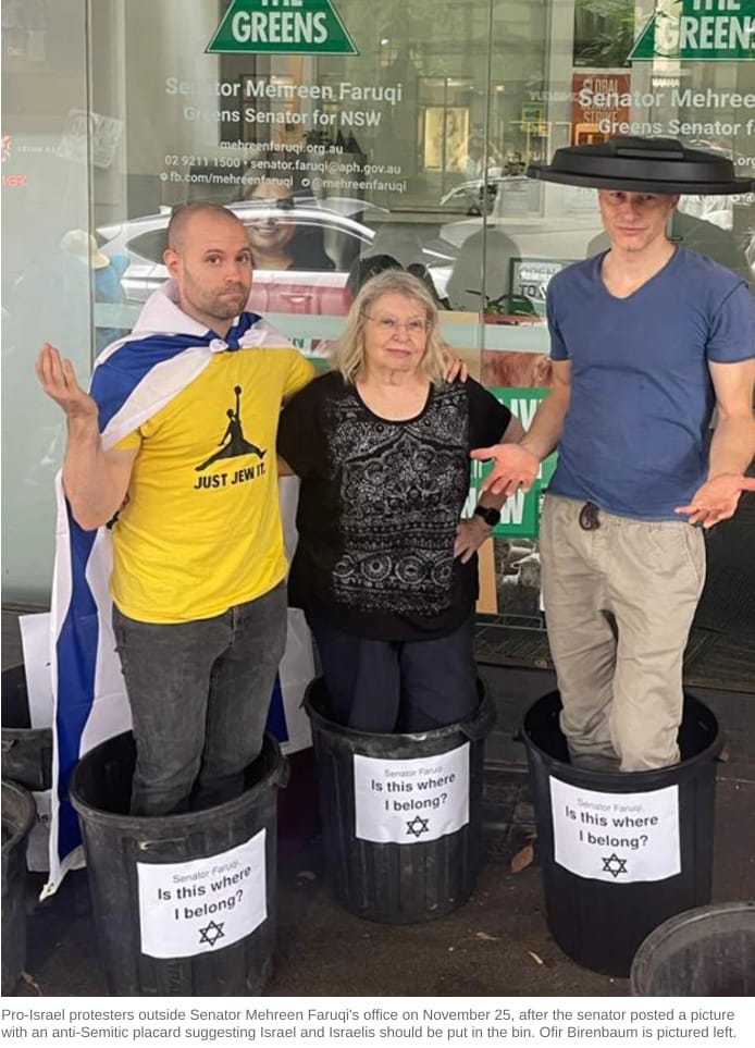 In November 2023, Birenbaum was quoted extensively in The Australian after organising a rally outside the electorate office of Greens senator Mehreen Faruqi, during which he and other Zionists stood in bins.