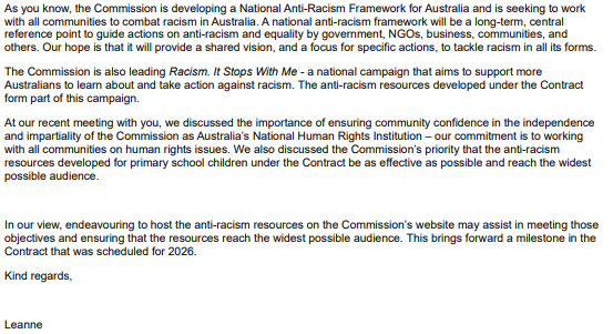 In response to Sofat asking for “insight into the concerns clearly outlined that have led to this decision,” Smith sent a follow-up email on April 29 outlining the Commission’s reasons for reducing the contract: to “[ensure] community confidence in the independence and impartiality of the Commission as Australia’s National Human Rights Institution,” and that “endeavouring to host the anti-racism resources on the Commission’s website may assist in … ensuring that the resources reach the widest possible audience”.