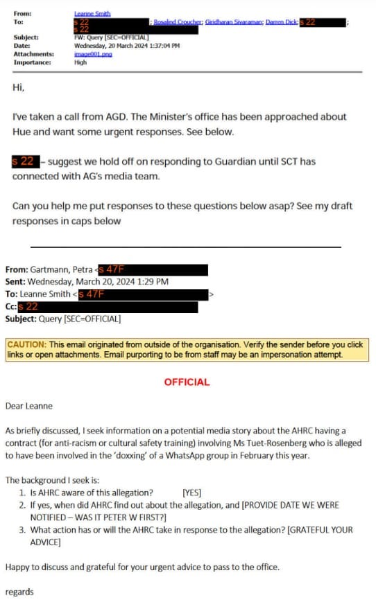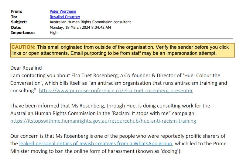 “In our view, if Ms Rosenberg was involved in the mass-doxing of the Jewish creatives group, then it is not appropriate for her to be engaged by the Australian Human Rights Commission in any capacity to do anti-racism work. Would you kindly look into the matter and let me know, preferably by cob [close of business] tomorrow, whether Ms Rosenberg continues to have any anti-racism role with the Commission and, if so, why this is considered appropriate.”