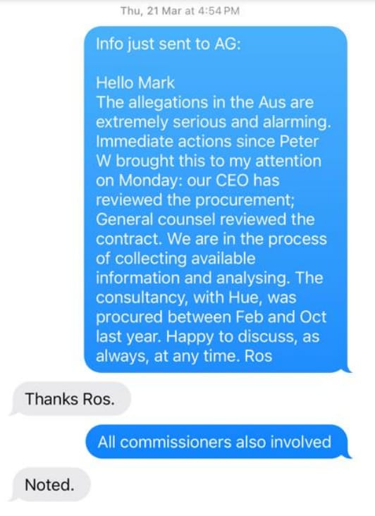 On Friday March 22, Croucher wrote to all Commissioners that “there is continued information gathering in relation to HUE, in light of the Australian article yesterday. We have a Commissioners’ meeting scheduled for Monday afternoon so this will be a priority matter for update.”