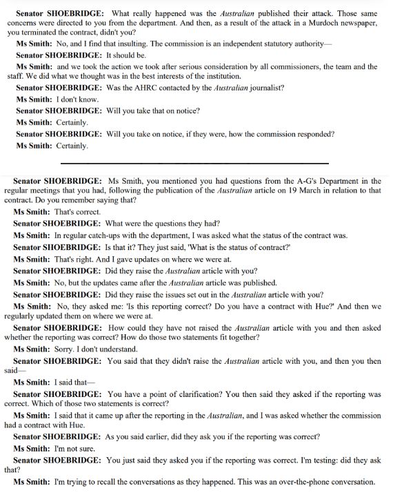 Smith also told Senate Estimates that the Commission had not received “instructions” from the Attorney-General’s Department to take action on the Hue contract, and disputed Greens Senator David Shoebridge’s assertion that the Commission had shortened the contract in response to the negative article in The Australian.