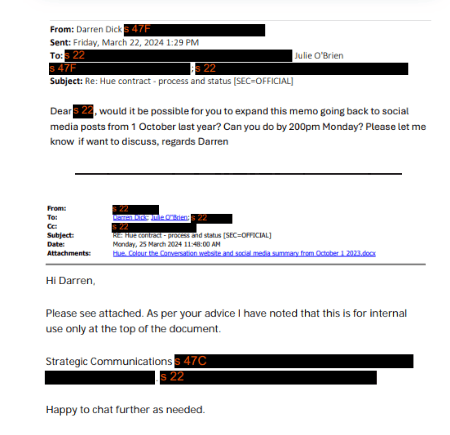 On Friday March 22, Dick requested an unnamed Commission employee to prepare a memo summarising Hue’s social media posts going back to October 1, 2023. The employee sent the document, titled ‘Hue. Colour the Conversation website and social media summary from October 1 2023’, to Dick and O’Brien the following Monday, March 25.