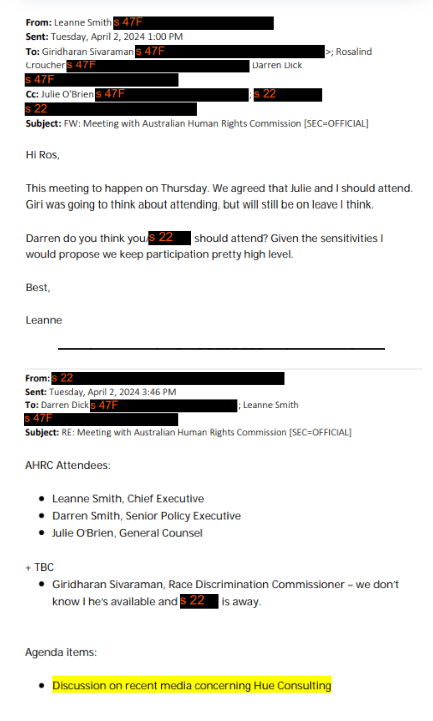 Among the Commission’s senior leadership, knowledge of the contract’s details before Croucher received Wertheim’s message appears to have been minimal. On the same afternoon, a staff member emailed Croucher “as requested” with basic details about the contract, including that it was for the provision of educational anti-racism resources in primary schools and that it was executed in October 2023. That evening, longtime Commission senior policy executive Darren Dick asked a Commission staff member who at Hue was working on the resources, and if Tuet-Rosenberg was “directly involved”.