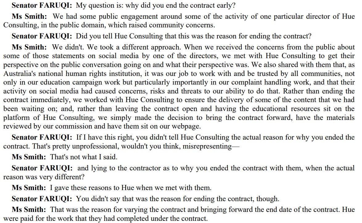 Appearing before Senate Estimates a month later on May 31, Smith admitted under questioning from Greens Senator Mehreen Faruqi that the Commission’s real reason for reducing the contract was different to the reasons Smith had given Hue, and that the Commission had decided to take “a different approach”.