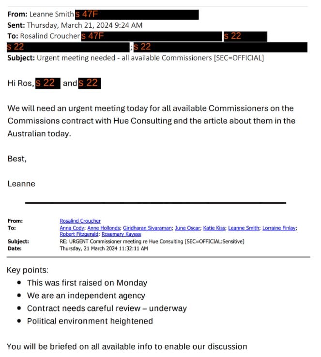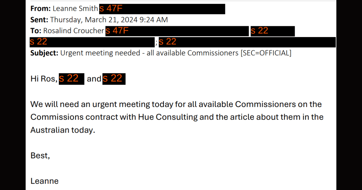 At 9.24 that morning, Smith emailed Croucher calling for “an urgent meeting today for all available Commissioners” to discuss the Hue contract and The Australian’s article. A Zoom meeting with all available Commissioners and Commission general counsel Julie O’Brien was scheduled for 12.30 that afternoon.