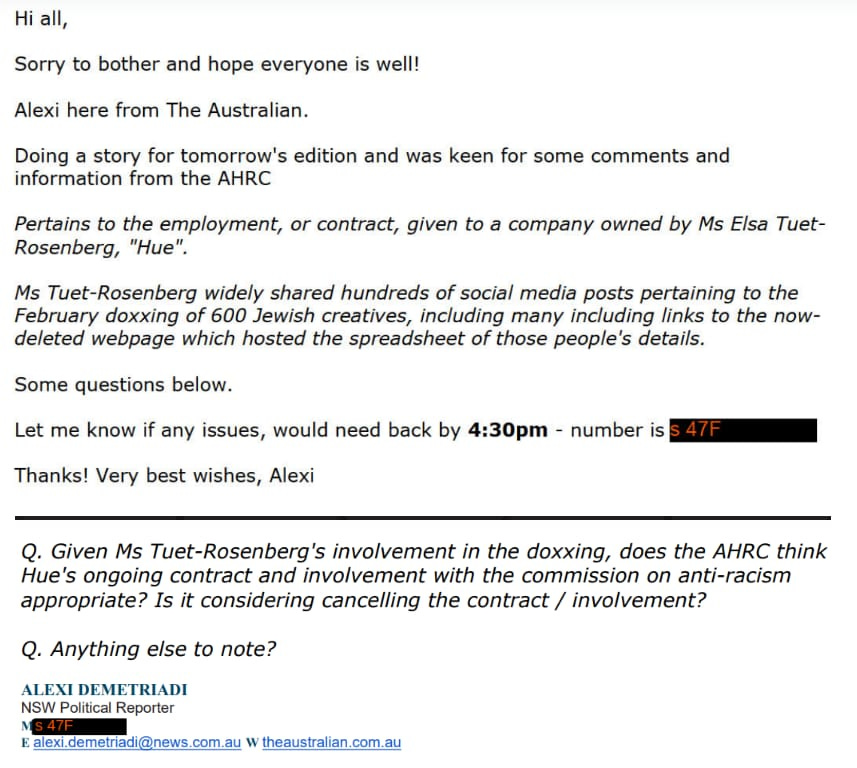 On the morning of Wednesday March 20, the Commission’s media unit received a request for comment from Alexi Demetriadi, The Australian’s NSW political correspondent. Demetriadi asserted that “Tuet-Rosenberg widely shared hundreds of social media posts relating to the February doxxing of 600 Jewish creatives” and asked if the Commission was considering cancelling the Hue contract.