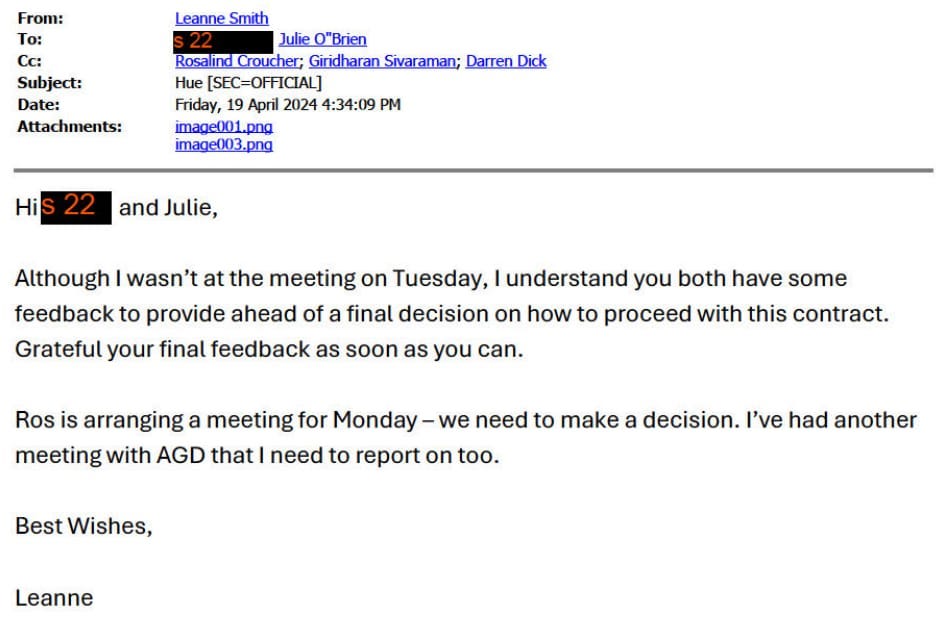 On Friday April 19, Leanne Smith wrote that she had had “another meeting” with the Attorney-General’s Department and detailing that the Commission’s senior leadership would meet to make a final decision regarding the Hue contract on the following Monday, April 22.