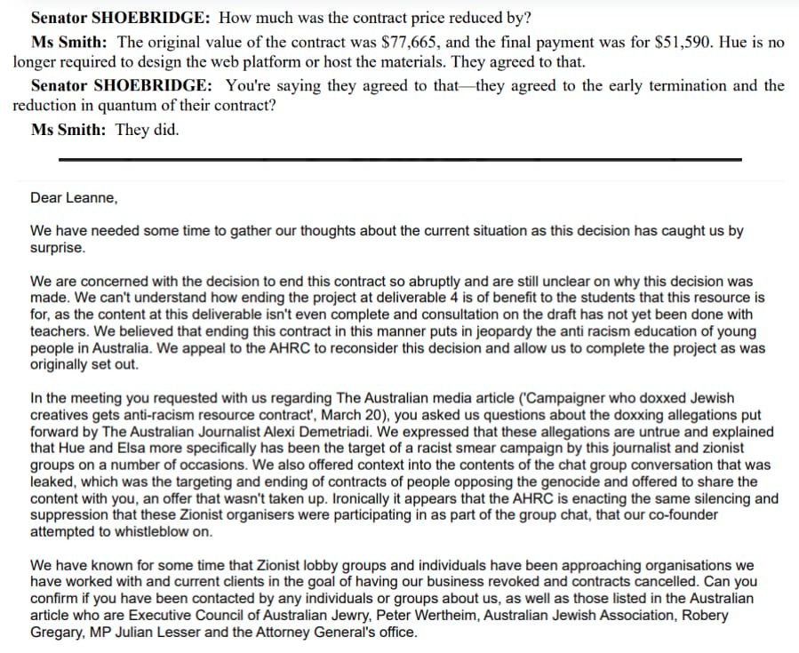 It was not the first time Tuet-Rosenberg had been the subject of an inflammatory and misleading article in The Australian. By the time the Hue contract became a source of contention at the Commission, Demetriadi and The Australian had already published several articles targeting Tuet-Rosenberg over her involvement in the leaked transcript of the ‘J.E.W.I.S.H Australian creatives and Academics’ WhatsApp group in January. Tuet-Rosenberg was one of the activists who facilitated the transcript’s release, including by redacting personal information that members of the group had posted in the chat.