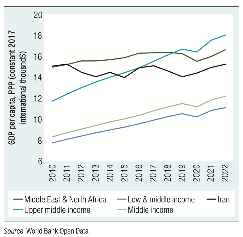 Iran has the largest gas reserves and fourth largest oil reserves in the world. Yet, it has been in the midst of sanctions-induced economic stagnation since 2011. The below World Bank chart shows Iran’s GDP per capita – once among the highest in the region – barely growing in real terms, only to be eclipsed by other upper middle income countries.