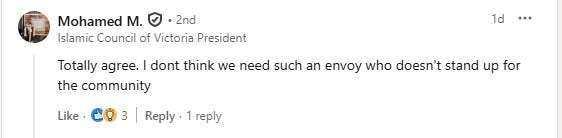 Islamic Council of Victoria President Mohamed Mohideen was scathing of Malik’s invitation to Hanson, writing on LinkedIn: “I don’t think we need such an envoy who doesn’t stand up for the community.”