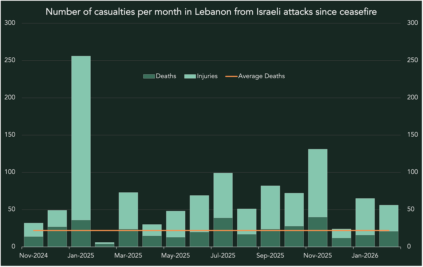 A collation of all incidents publicly documented by Lebanon’s Ministry of Public Health shows that Israel has killed 350 people in Lebanon since the ceasefire began — an average of 22 deaths per month — and wounded a further 793.