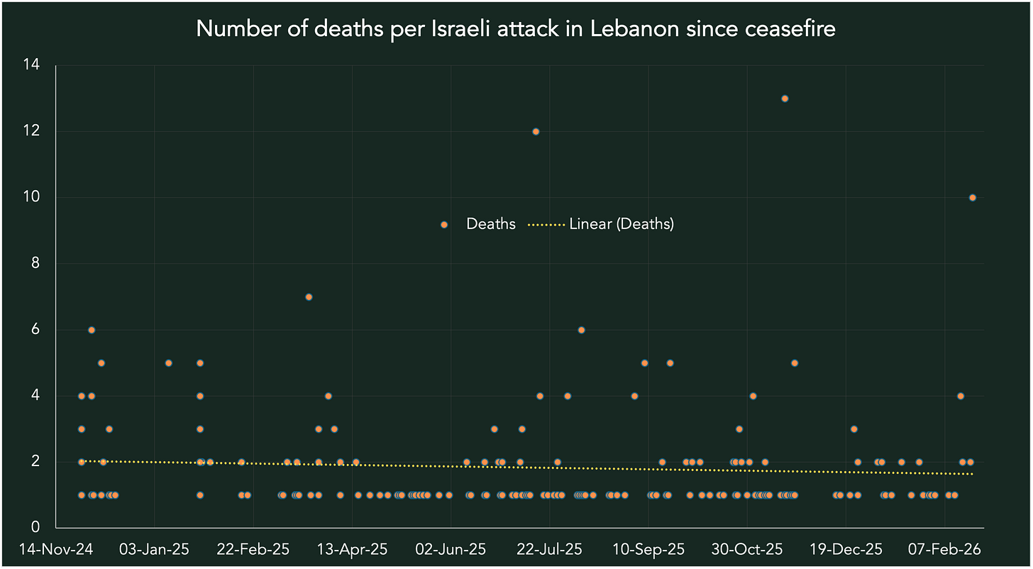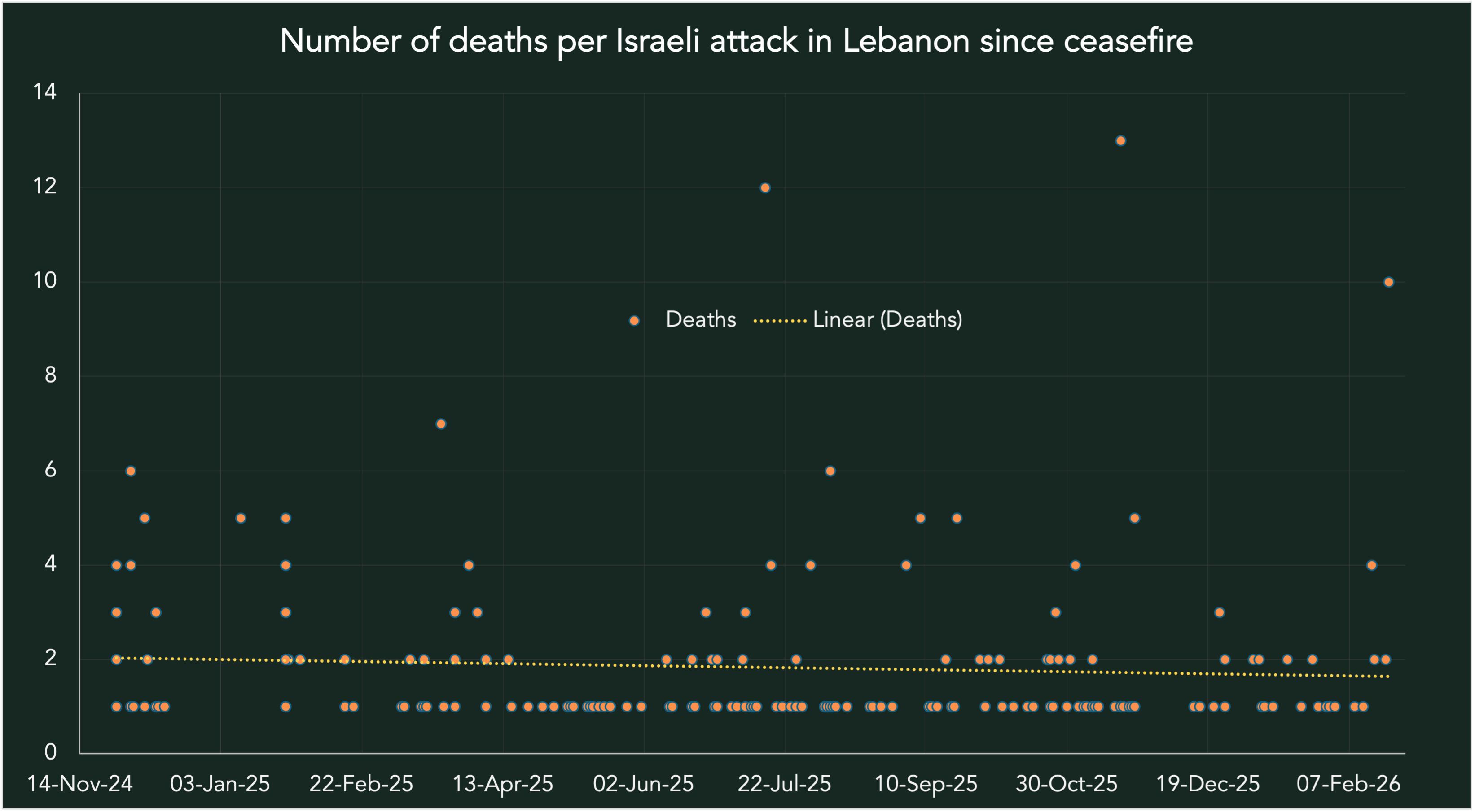 A UN report last November revealed that Israel had violated the ceasefire 10,000 times, including land, air and sea violations. Atlas Assistance – whose figures are drawn upon by humanitarian organisations – listed a total of 2,932 Israeli attacks on Lebanon since November 2024 (excluding February 2026), with an uptick in December 2025 and last month.