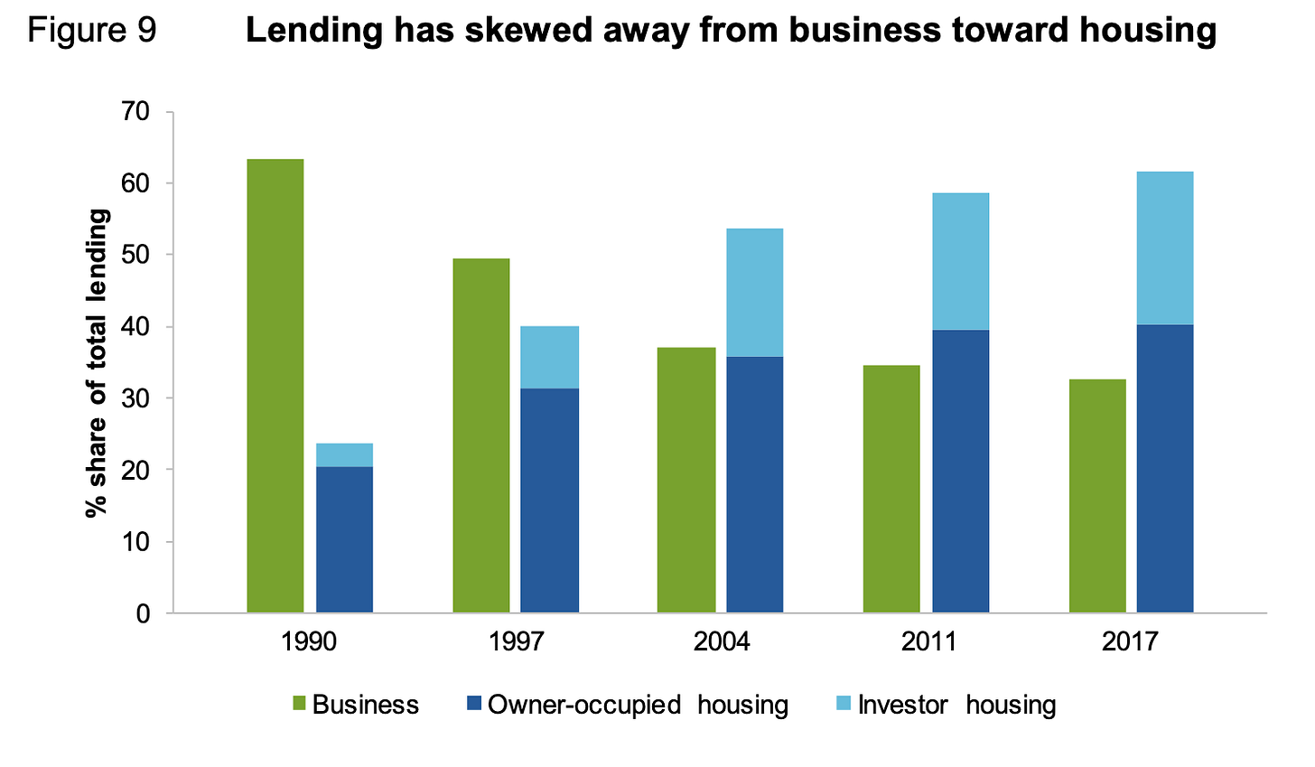 The best way to understand this fundamental transformation is through the banks and where they lend money. In 1990, over 60% of all bank lending went to businesses and just over 20% to housing, of which investor housing was a small fraction. By 1997, the total proportion of bank lending for housing loans doubled to over 40%, driven by an explosion in lending to investors, while loans to businesses dropped below 50%.