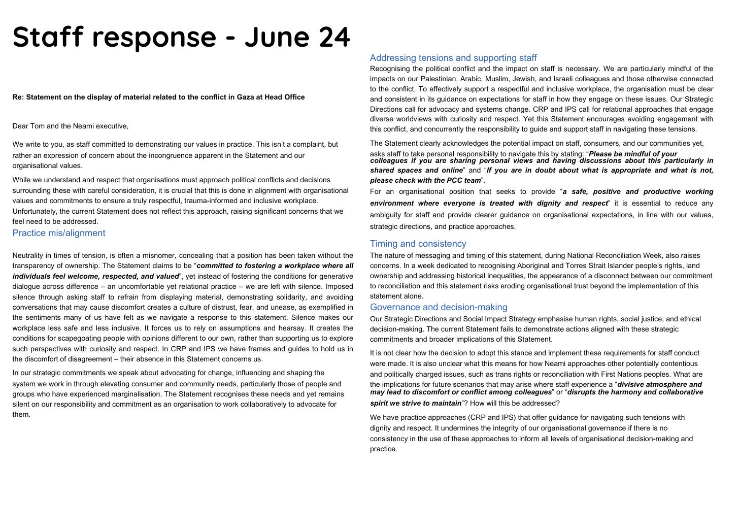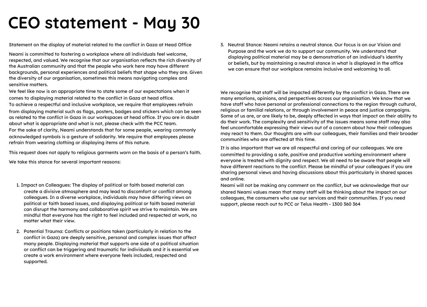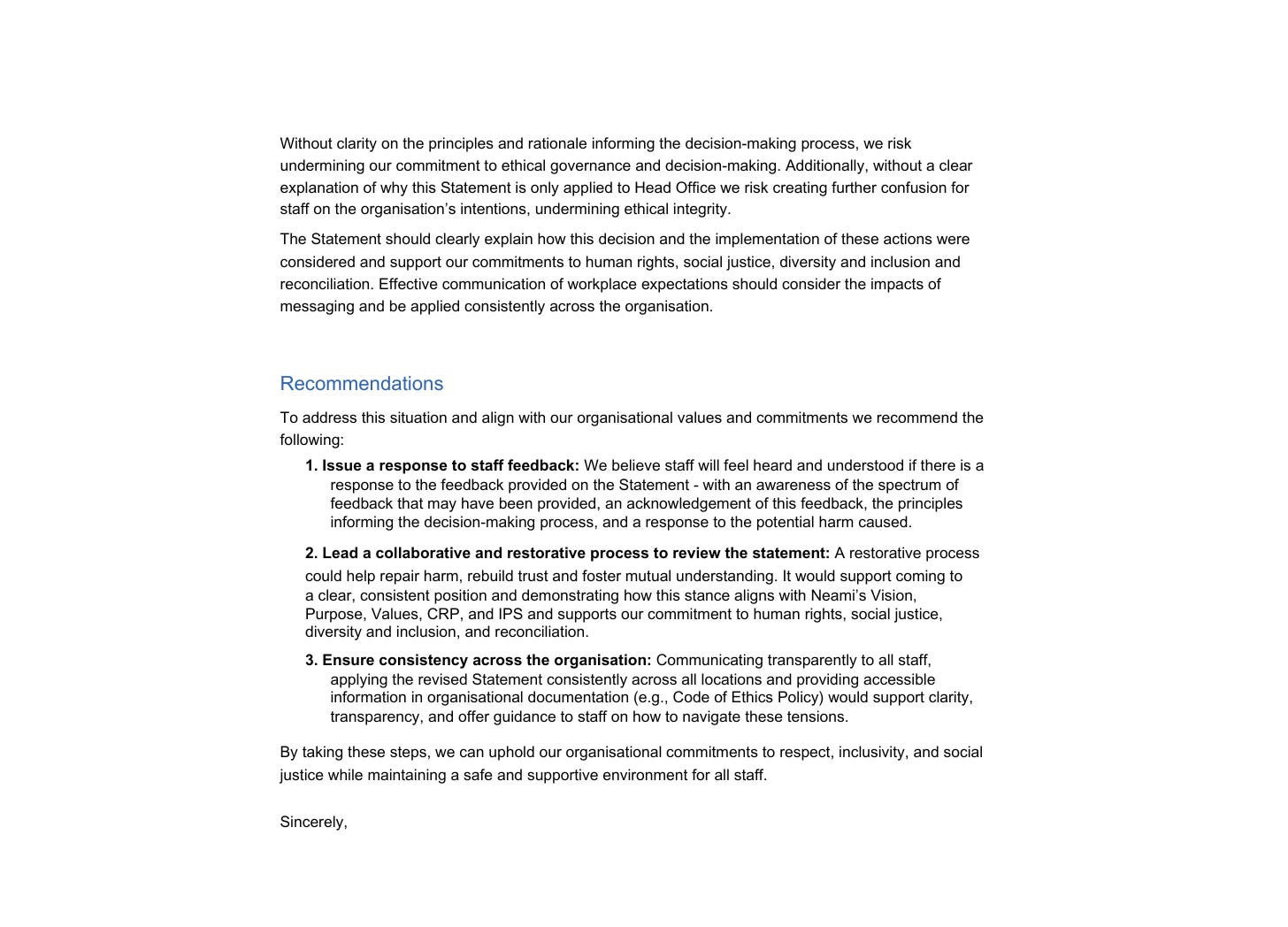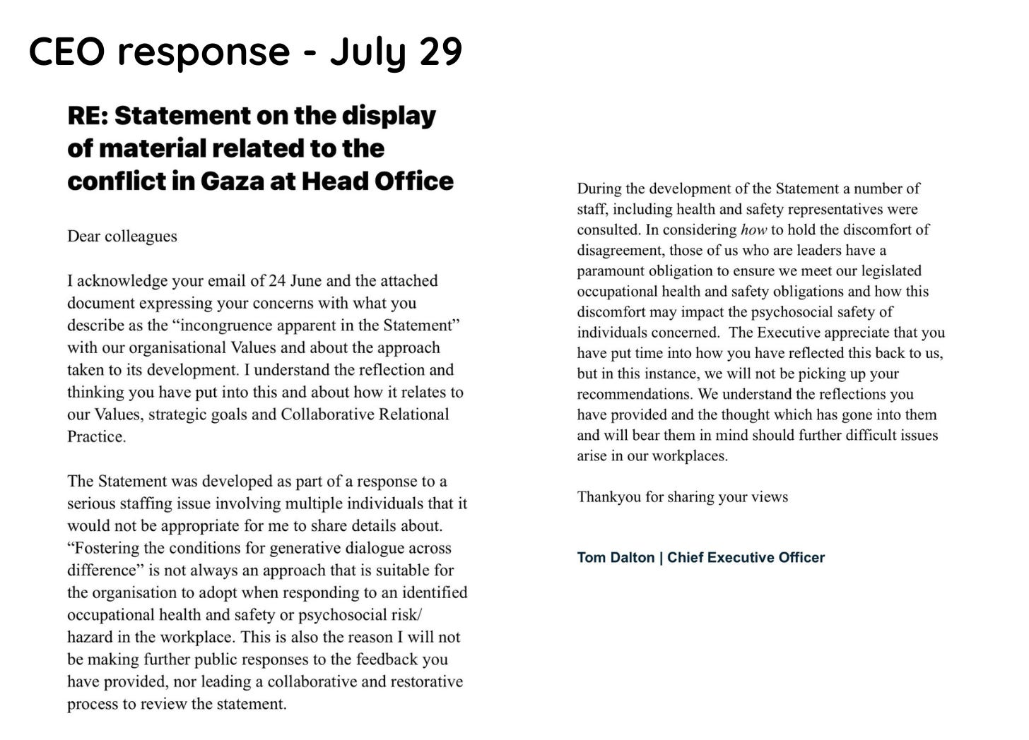 The staff email, however, highlighted the "incongruence apparent in the [CEO] Statement and our organisational values", emphasising the disconnect between Neami National's stated principles and its position on staff solidarity with the Palestinians.