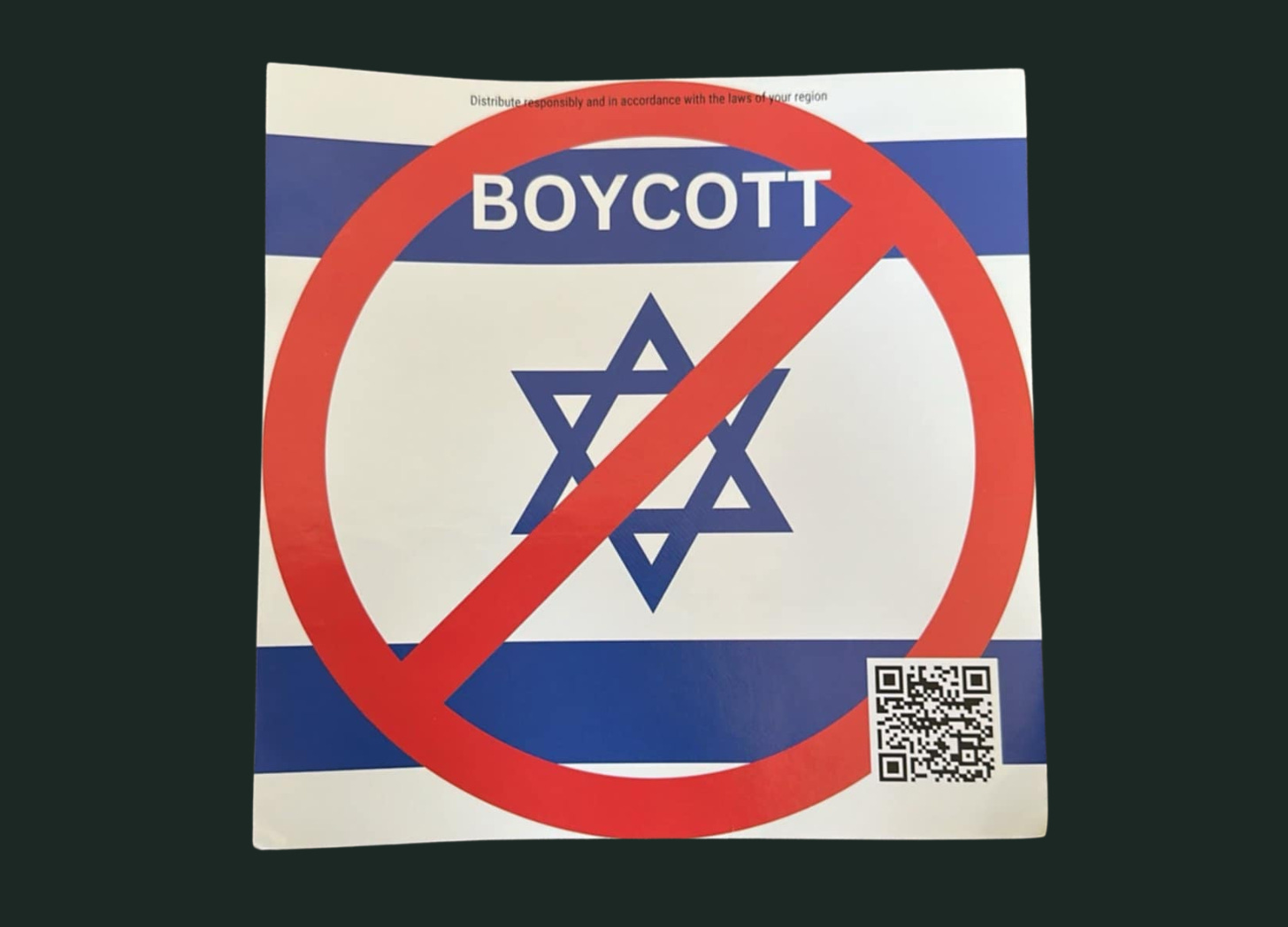 The sticker includes a QR code link to Free Palestine Printing, an online store that produces pro-Palestinian clothing, accessories and prints.