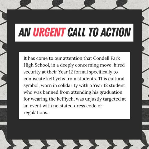 In response to public backlash, Condell Park High has doubled down. On Thursday November 28, school staff and private security hired by the school denied several students entry to their formal at Doltone House for wearing keffiyehs in solidarity with their classmate. (Responding to online criticism, Doltone House has stated that their staff and management had no involvement in the decision.)