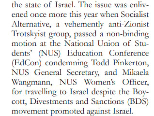 In 2013, delegates at NUS’ education conference of that year voted to condemn then-NUS general secretary Todd Pinkerton and then-NUS women’s officer Mikaela Wangmann for travelling to Israel on a trip sponsored by AIJAC.