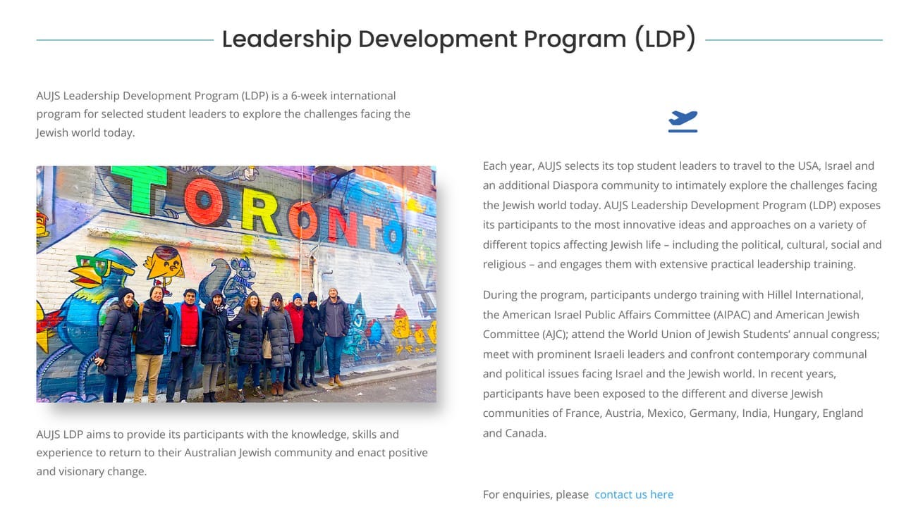 The Australasian Union of Jewish Students (AUJS) also regularly organises paid trips for politically active students through its annual Israel Mission program, which aims “to educate and challenge young leaders about the complexities of the Israeli/Arab conflict” in the hope that “when they return to their respective political groups, they will gain a greater sensitivity and understanding of the conflict’s different perspectives.”