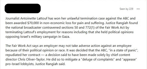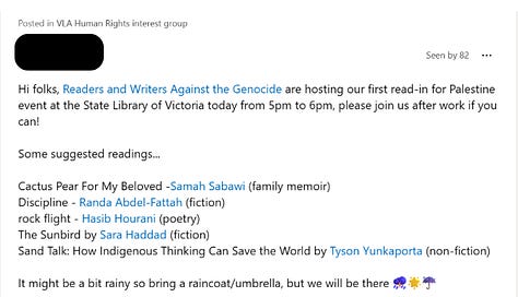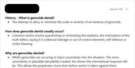 A former VLA employee who wishes to remain anonymous has provided Deepcut with screenshots of posts that were removed from a work VIVA Engage community dedicated to issues of human rights. The posts included a news item about journalist Antoinette Lattouf’s victory in her unlawful dismissal lawsuit against the ABC, a text post about the history of genocide denial, and an invitation to an event organised by Readers and Writers Against the Genocide.