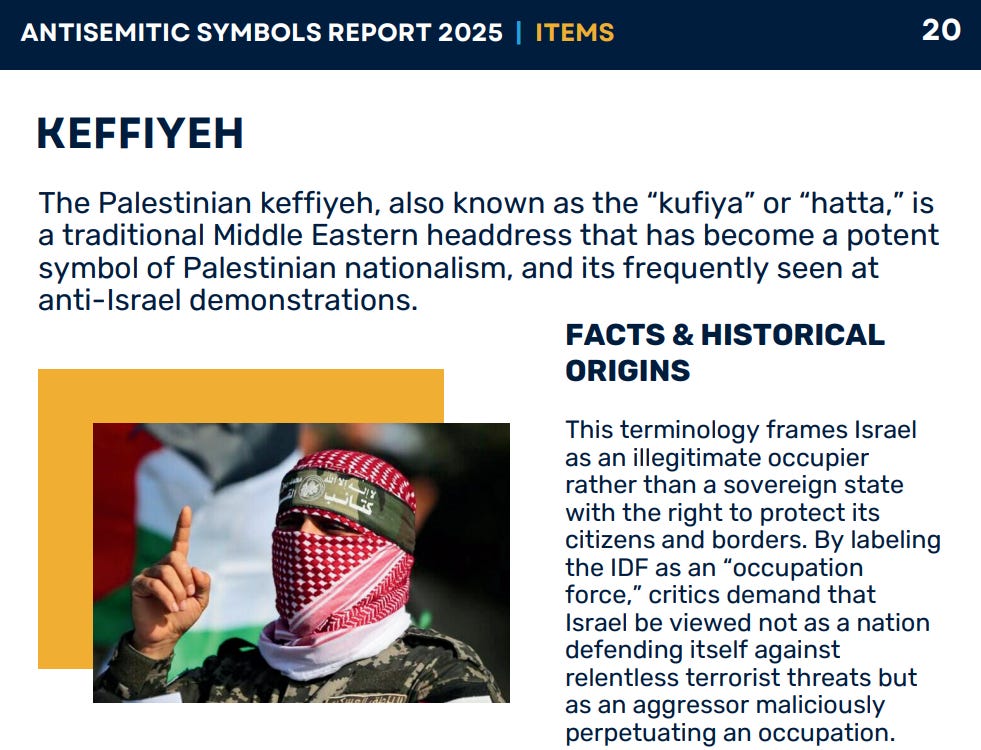 “Many Jews view the keffiyeh as an indicator of hostility, given its use by individuals and groups who have committed acts of terror against Jewish and Israeli targets,” the pamphlet states.