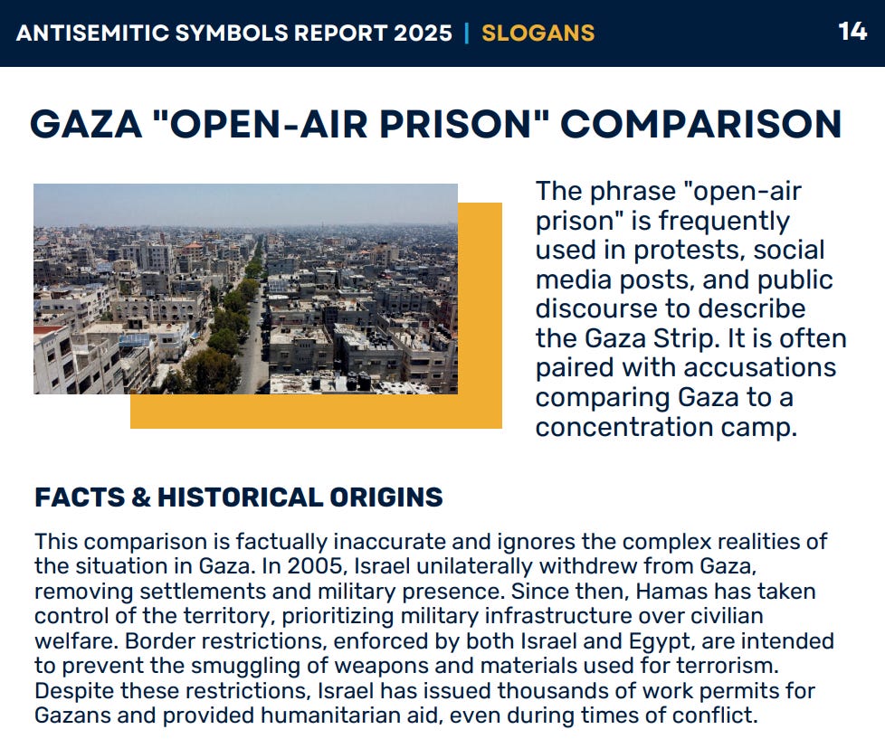 The leaflet, however, says such a comparison “fuels antisemitism by delegitimizing [sic] Israel’s security measures” and that it “incites hostility against Israel by falsely portraying it as a perpetrator of mass oppression”.