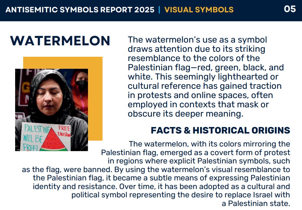 “This report openly expresses and fosters anti-Palestinian racism. It conflates Palestinian symbols of Palestinian identity and culture like the keffiyeh and the watermelon, and even simple calls for freedom and justice, as ‘hatred of Jewish people’,” Mashni added.